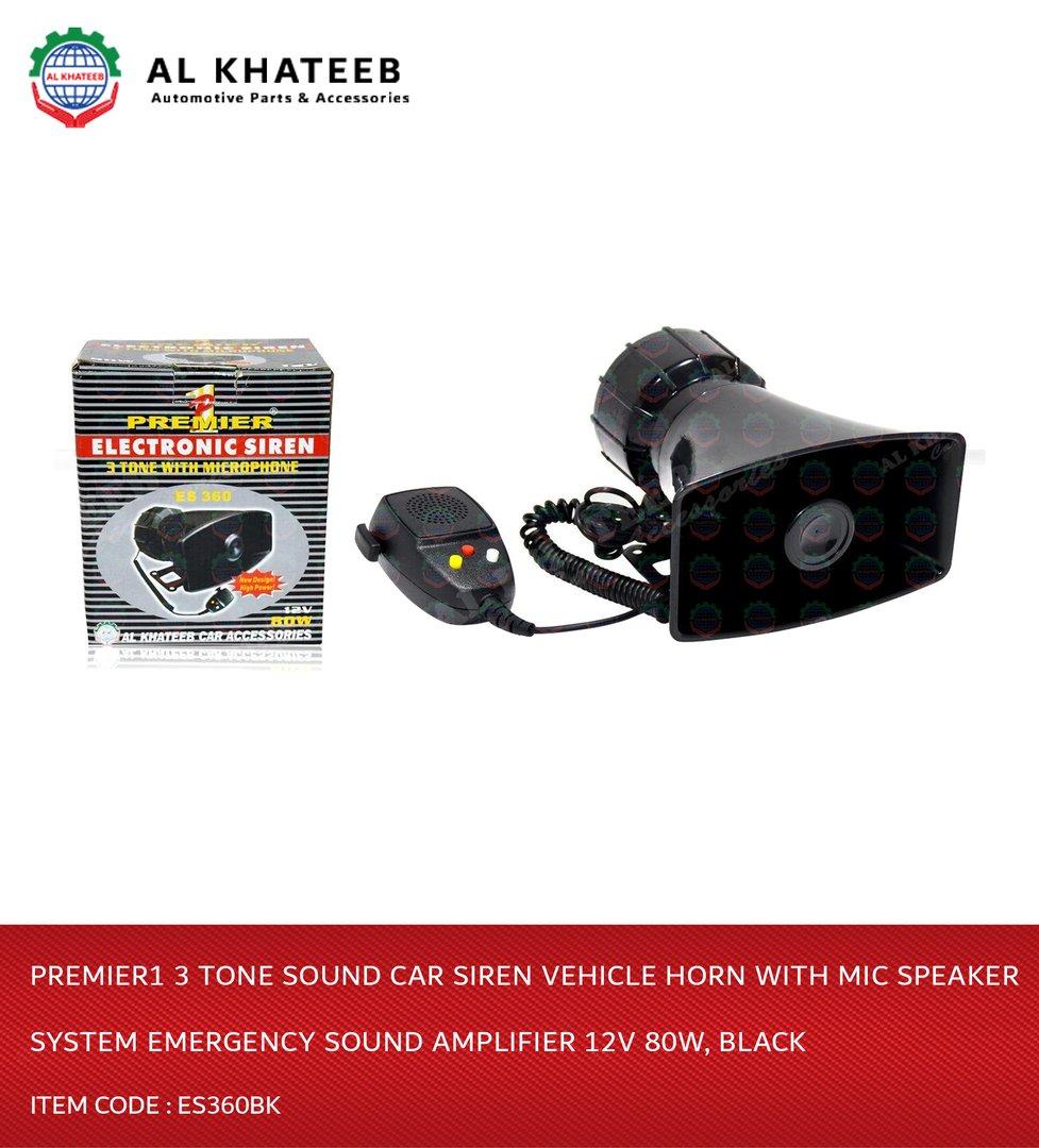 Premier1 3 Tone Sound Car Siren Vehicle Horn With Mic Speaker System Emergency Sound Amplifier 12V 80W, Black Es360